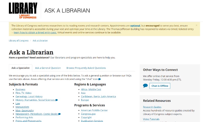 The Library of Congress website also has a useful ‘Ask a Librarian’ feature where you can ask questions or doubts to librarians and program specialists via chat service. It is available for subjects and formats like business, law, manuscripts, performing arts, science, technical reports, humanities, rare books, and special collections, among others.