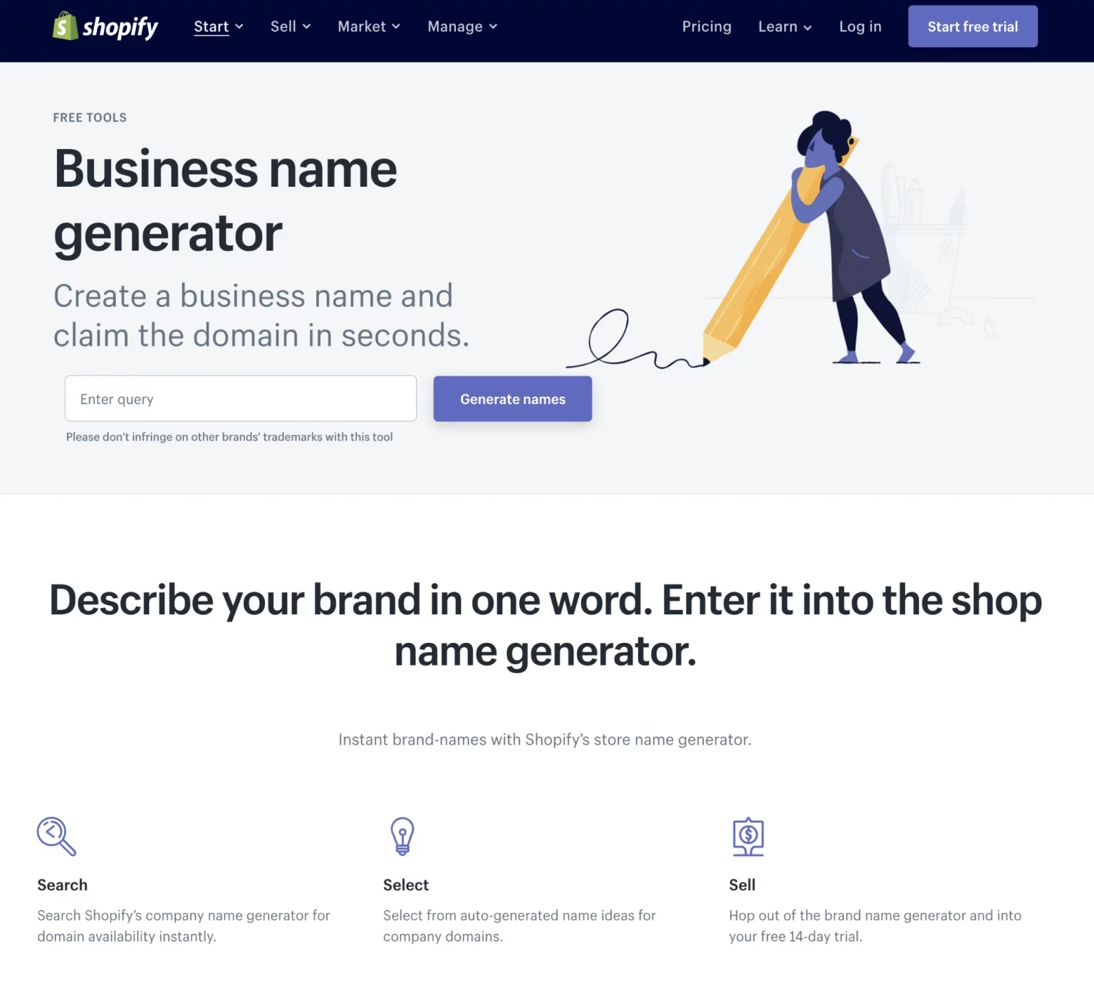 You can also use a domain name generator to find ideas for your new domain. Shopify provides this tool for free. All you have to do is load the tool and add a keyword, and you will receive a list of unique domains through Shopify itself.