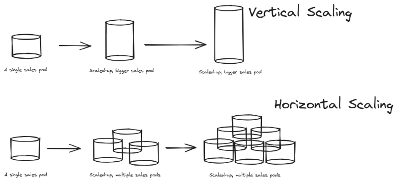 As an organization grows, multiple sales pods can be deployed while keeping the size of a pod roughly the same. This makes sales pods a horizontally scalable sales model, as the best way to scale the model is to increase the number of new sales pods within a sales organization, not the number of salespersons within a pod.