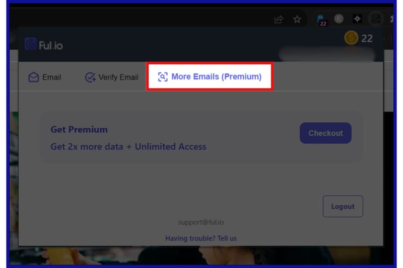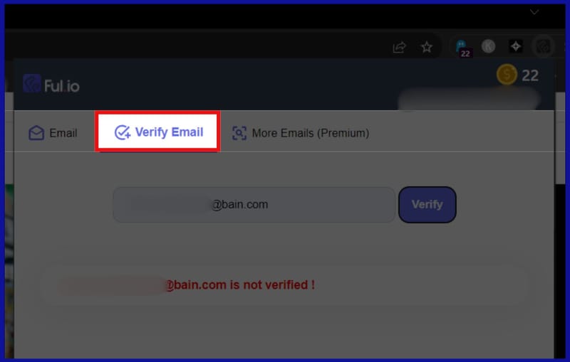 Upon logging in, you get 25 credits depicted by gold coins on the top right corner of the extension. Each time you make a request for email extraction on a domain, one credit will be used, and verifying an email will cost another credit.