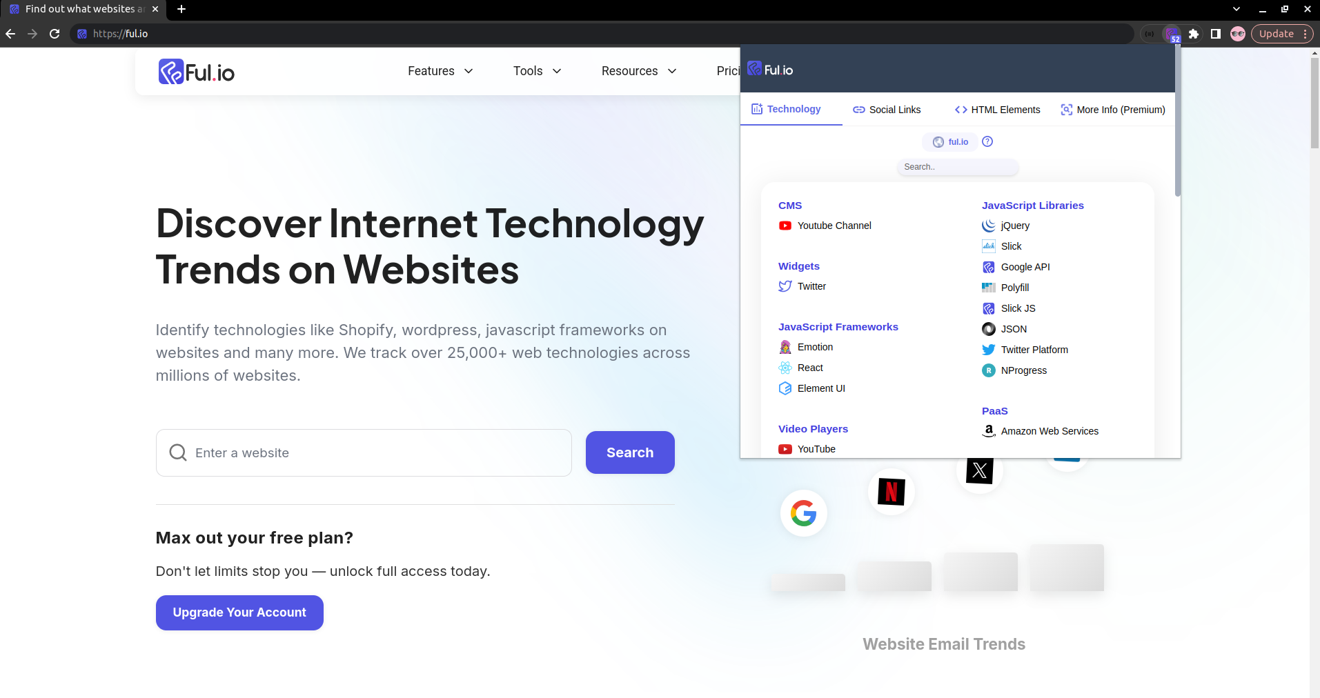It lets users perform limited technology lookups for free, beyond which a free account is needed to continue. If the user needs to exceed 50 lookups a month, then Wappalyzer has paid options starting from $250 a month.